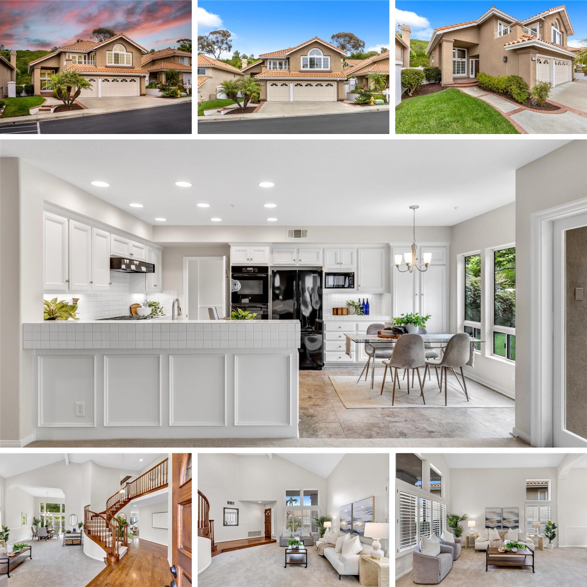 Tucked within the exclusive enclave of Brisa Del Mar, 1706 Avenida Crescenta is a meticulously maintained 5-bedroom, 3-bathroom home offering the largest floor plan with 2,924 sq ft of pristine living space, including a main-level bedroom and full bath—ideal for guests or multi-generational living. From the moment you enter, you’ll notice the fresh new interior paint in a creamy white, upgraded lighting, and plank wood flooring that set the tone for this truly move-in-ready home. Soaring two-story ceilings and a wall of upper and lower windows in the formal living and dining areas flood the space with natural light, while French doors provide seamless access to the private backyard. The oversized kitchen makes creating your favorite meals and treats easy—complete with crisp white cabinetry, sleek black appliances, and an open flow into the family room, where another set of French doors opens to the beautifully landscaped yard. Upstairs, the expansive primary suite does not disappoint with vaulted ceilings, dark wood accent beams, hillside views, and a spacious en-suite bath featuring a white-finish dual-sink vanity, soaking tub, walk-in shower, private water closet, and an oversized walk-in closet. All guest rooms are generously sized, with two front bedrooms opening to a shared balcony that offers peek ocean and harbor views. Step outside to your private backyard oasis—backing to a lush green hillside, it offers the perfect balance of grassy play area and custom slate patio space and hardscaping. A built-in BBQ with a chef-grade grill is perfect for meals on those warm evenings, and the patio cover offers just the right amount of filtered light - ideal for outdoor dining and relaxing. Brisa Del Mar is a hidden gem of just 87 homes and offers an ocean-view pool and spa, and the two ocean-view parks with stunning vistas are the perfect spot to take in the 4th of July fireworks. Located in the master-planned community of Rancho San Clemente, you’re just minutes to top-rated schools, Rancho San Clemente Park, the private Life Time Fitness Club, shopping, dining, and, of course, the world-class beaches and surf of San Clemente. This is Southern California coastal living at its finest ... your best life starts right here!
